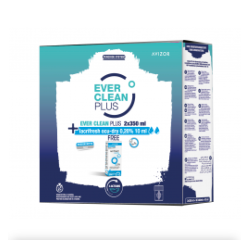 Ever Clean Plus: Sistema de desinfección de lentillas meidante peróxido de hidrógeno al 3%. Contiene agentes biotecnológicos para asegurar la eliminación máxima de las partículas de grasa que se adhieren a las lentes de contacto.